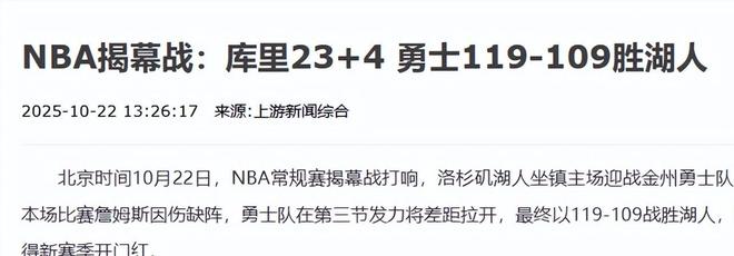 上游新聞綜合:(NBA揭幕戰:庫里23+4 勇士119-109勝湖人2025.10.22)