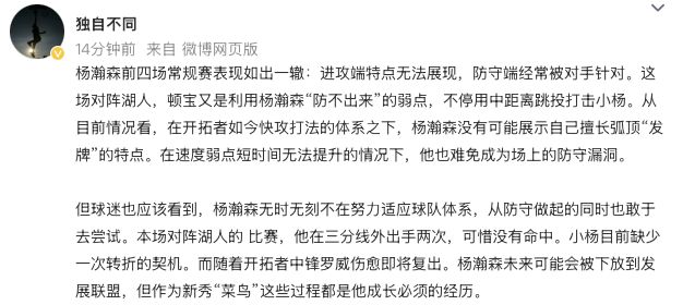 賽后,媒體人“獨(dú)自不同”發(fā)文點(diǎn)評(píng):